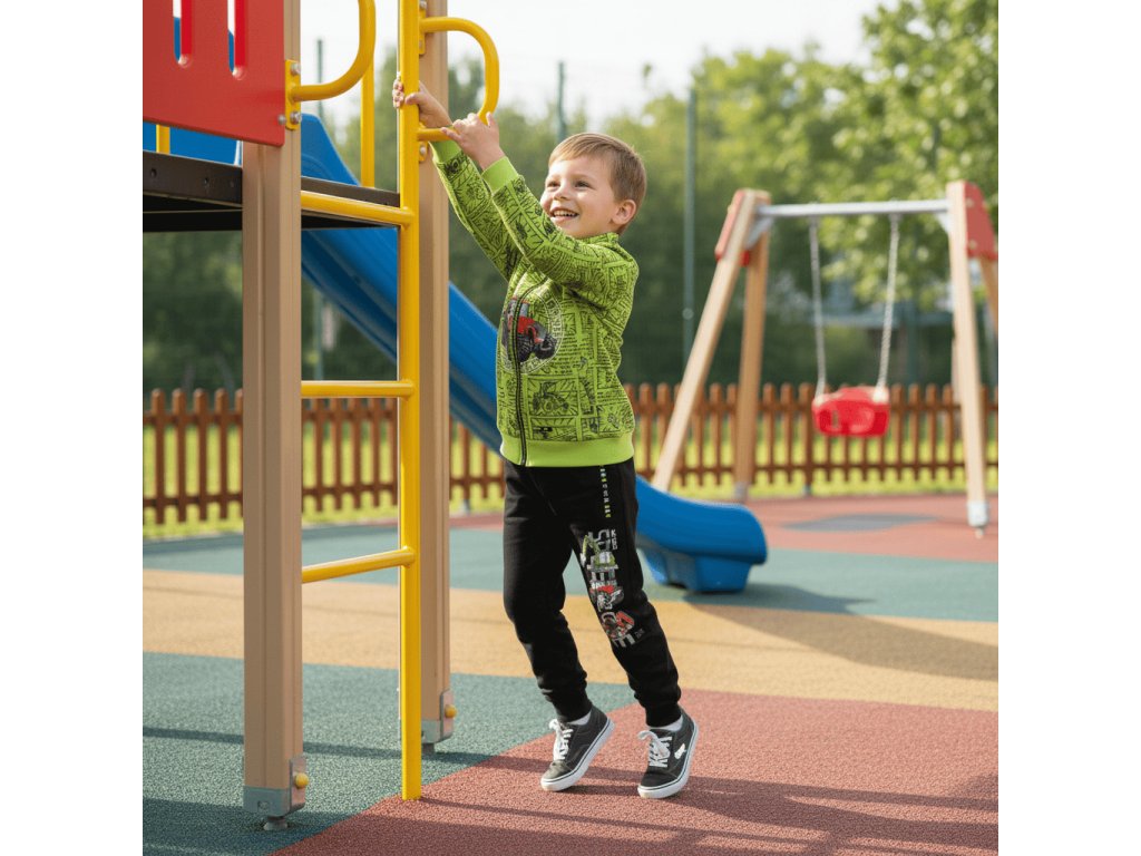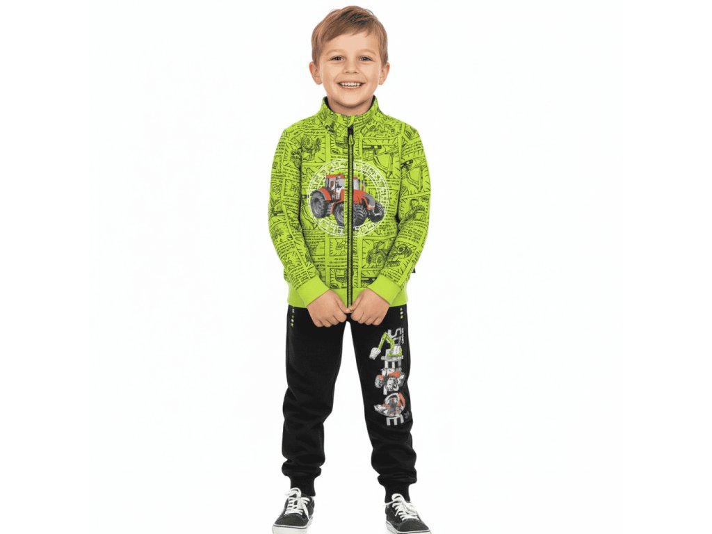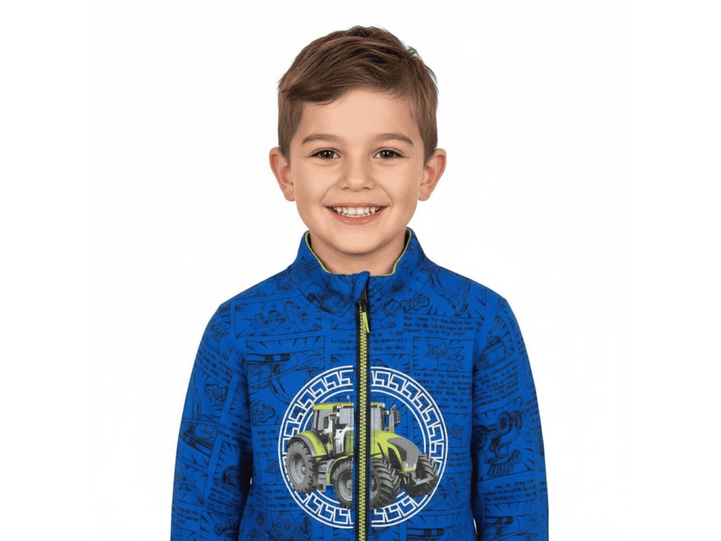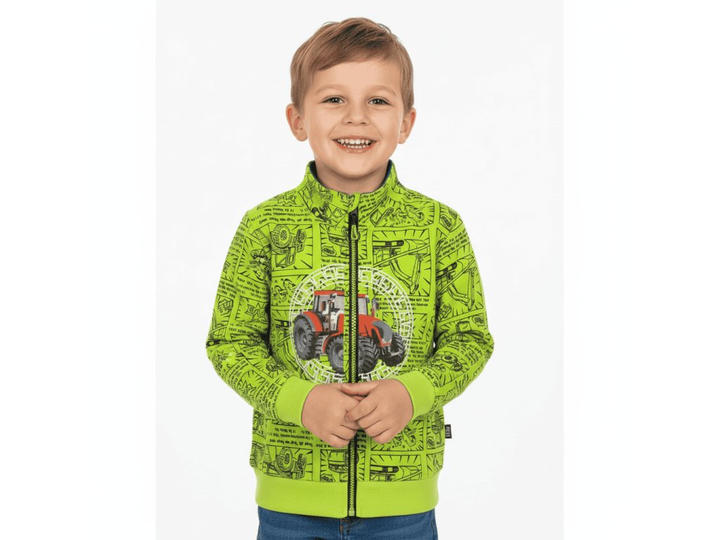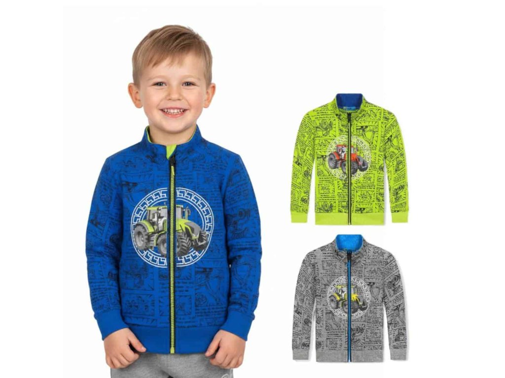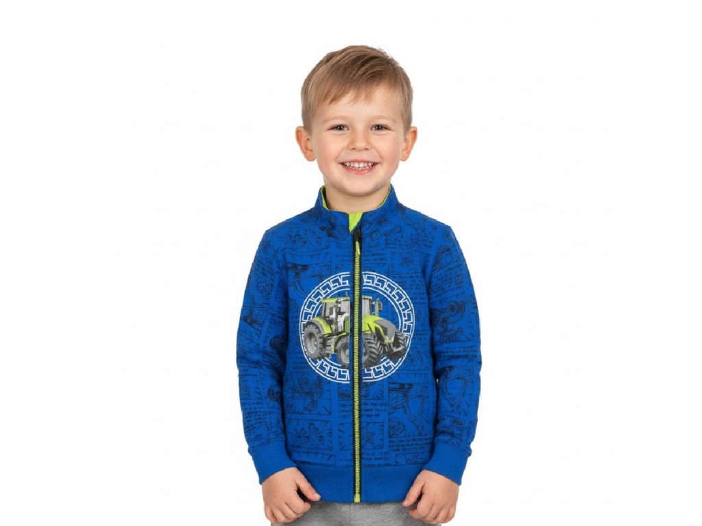 Velmi oblíbená tepláková chlapecká mikina ze 100% bavlny s obrázky traktorů. Mikina je v pase do pružného nápletu a dobře obepne jakoukoli postavu dítěte. Rukávy jsou rovněž do pružného nápletu, který zaručuje, že se rukáv nehrne dolů a dobře drží na zápěstí. Mikina je u krku zakončena stojacím límcem. Zapínání je na kosticový zip, to je plastový zip s většími zuby. Mikina má dvě boční kapsy.