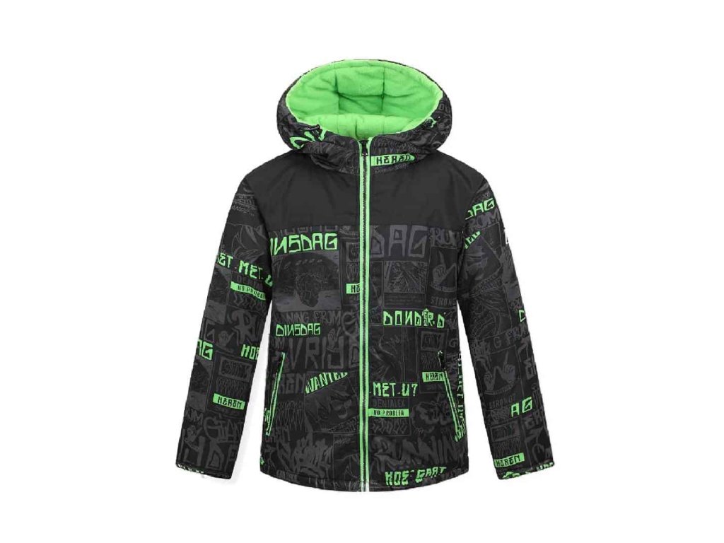 Zimní dětská bunda z materiálu připomínající látku, která ovšem zadrží nějakou tu vodu a sněhovou vločku, zateplená a podšitá fleecem. Bunda má  kapuci, která má gumičky s olivkami pro stažení kapuce k hlavě.