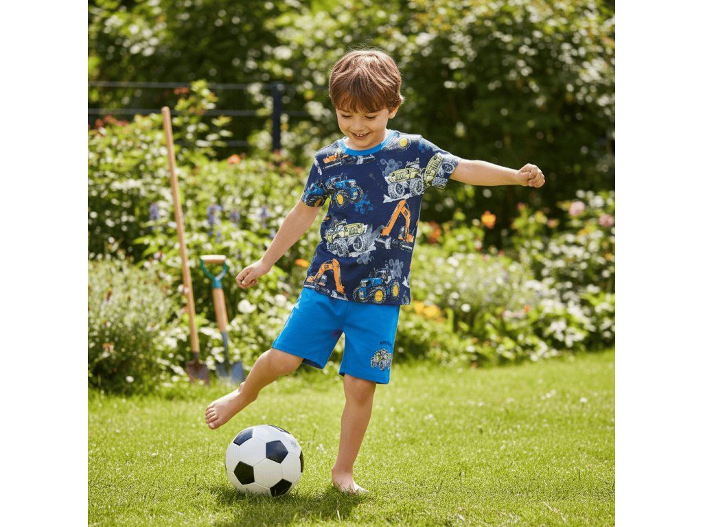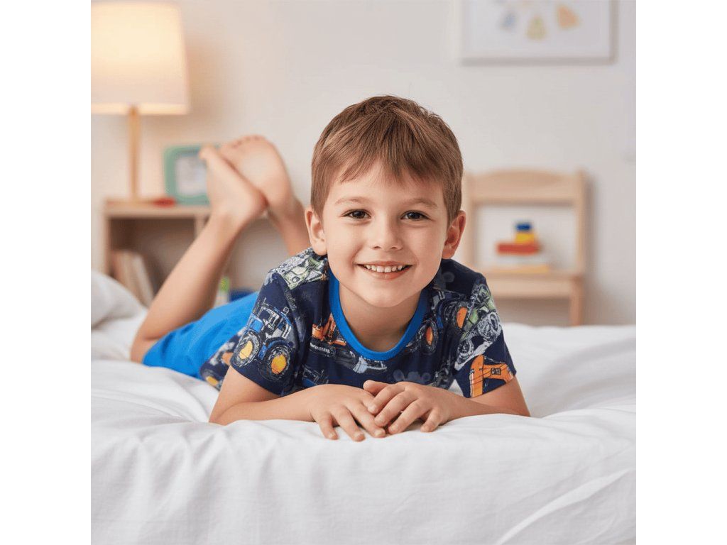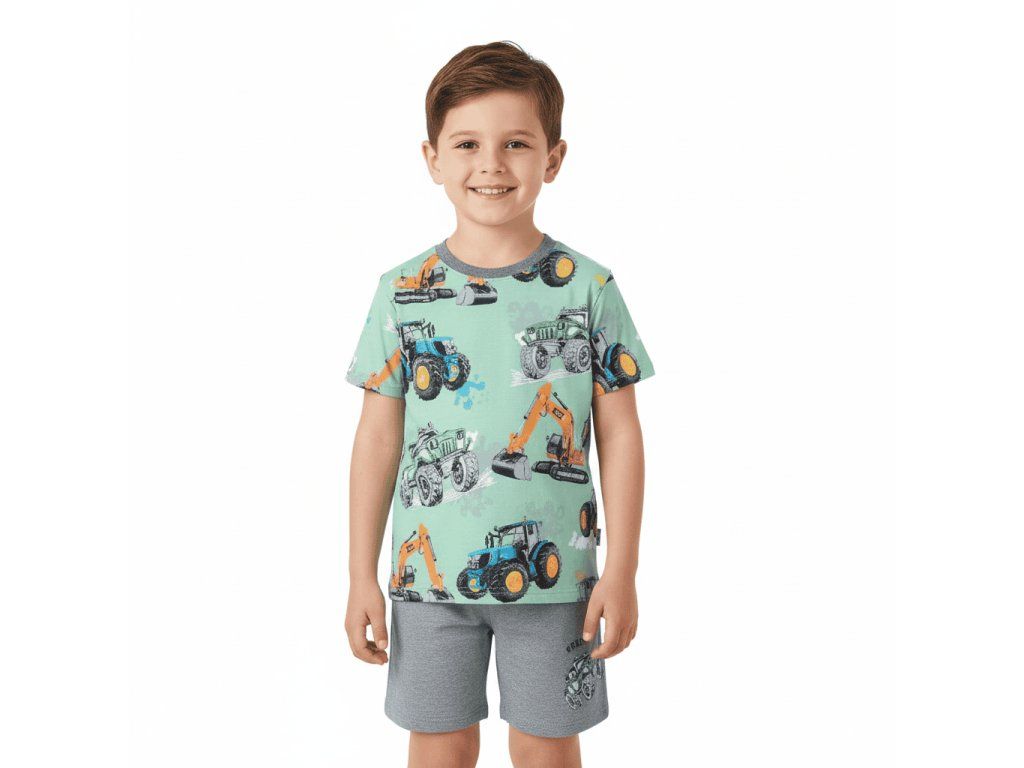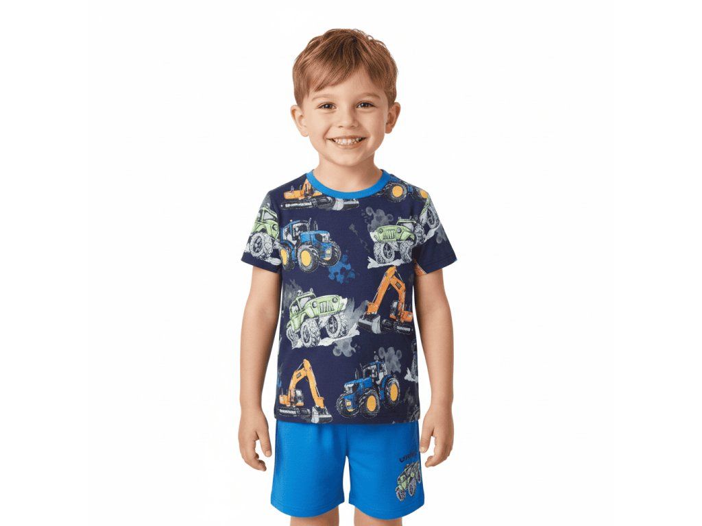 Dětské pyžamo s obrázkem traktoru značky KUGO, si na spaní zamiluje každý malý milovník traktorů a autíček. Tričko je s krátkým rukávem. Kraťasy jsou v pase do pohodlné gumy.