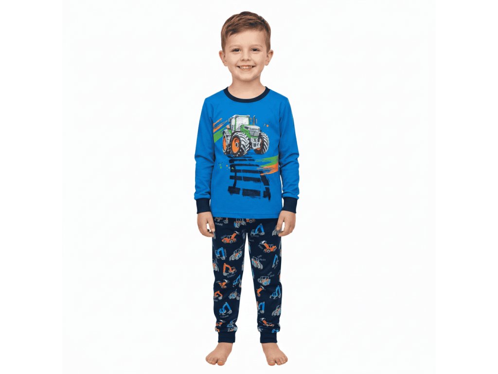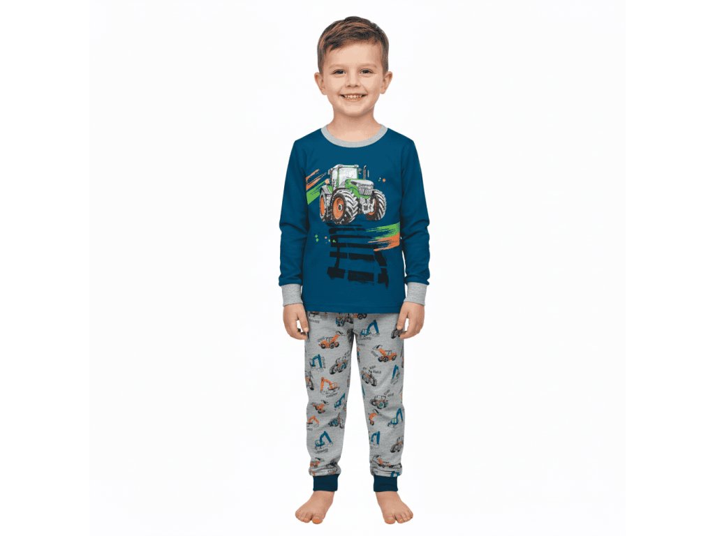 Dětské pyžamo s obrázkem TRAKTORU. Na rukávech a na nohavicích je pružný náplet, aby se jednoduše oblékalo, což ocení hlavně děti ve školce. V pase jsou kalhoty do pohodlné pružné gumy.