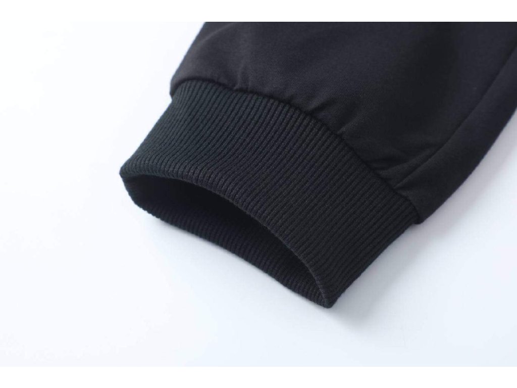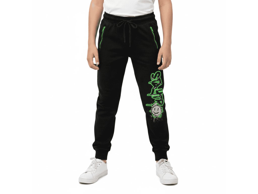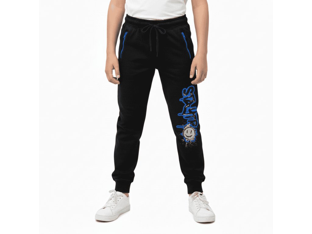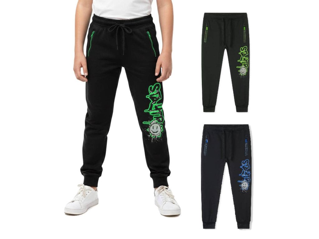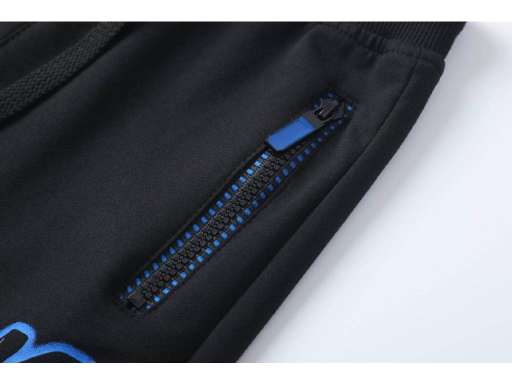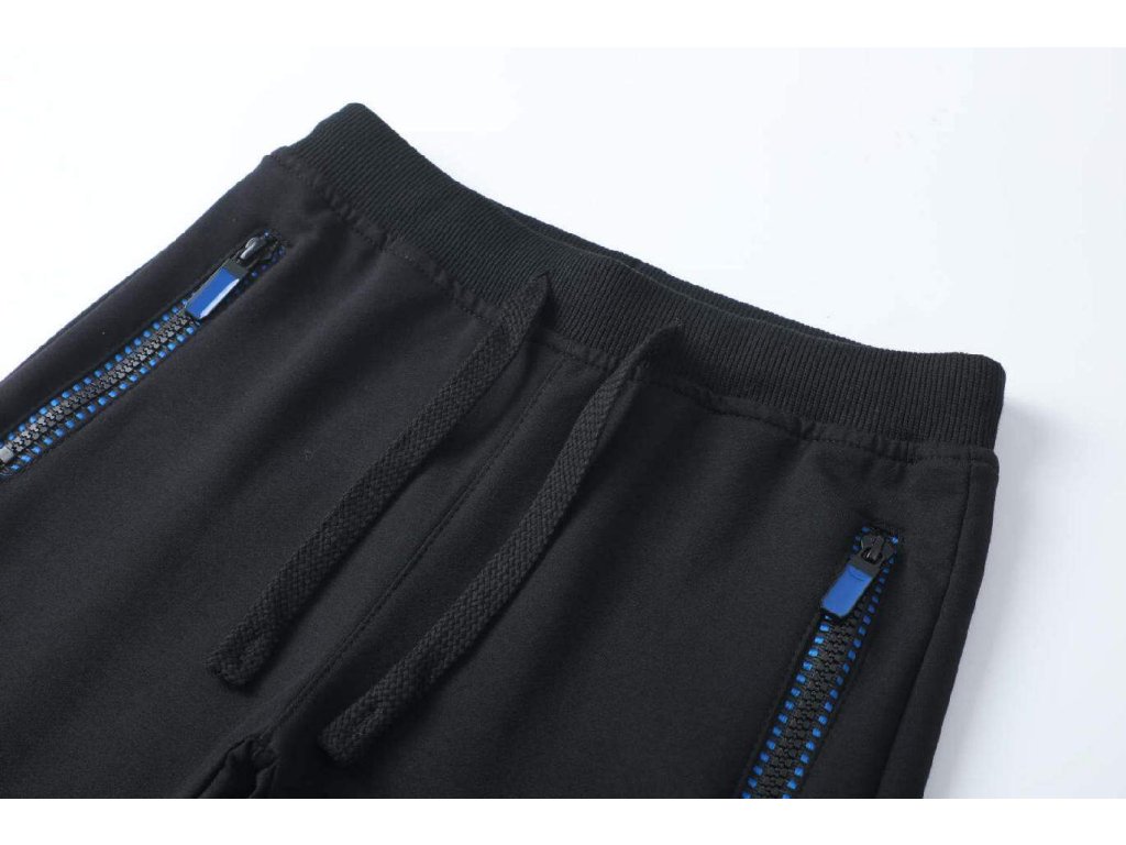 Chlapecké tepláky. V pase jsou do nápletu, uvnitř kterého je guma a  tkaničky na úpravu obvodu pasu. Tepláky mají dvě postranní kapsy na zip. Nohavice jsou zakončeny náplety, tudíž se nemusíte bát vzít i třeba o velikost větší, protože náplety nohavice udrží na kotníku dítěte.