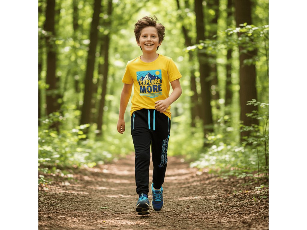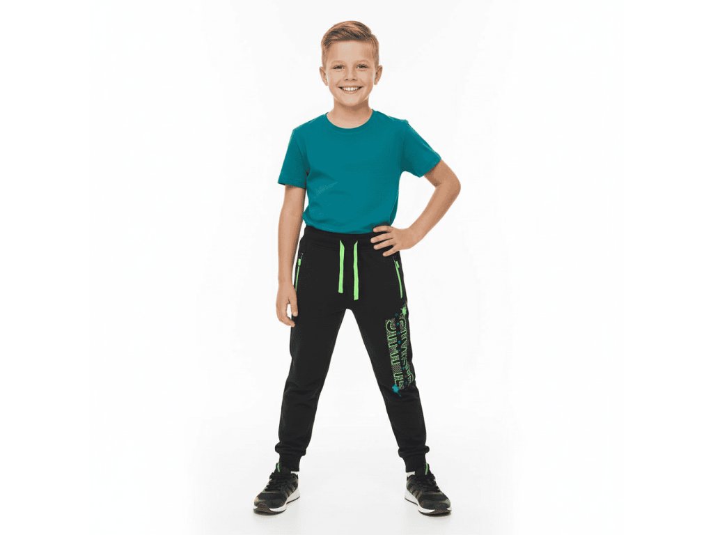 Bavlněné chlapecké tepláky. V pase jsou do nápletu, uvnitř kterého je gumatkaničky na úpravu obvodu pasu. Tepláky mají dvě postranní kapsy na zip. Nohavice jsou zakončeny náplety, tudíž se nemusíte bát vzít i třeba o velikost větší, protože náplety nohavice udrží na kotníku dítěte.