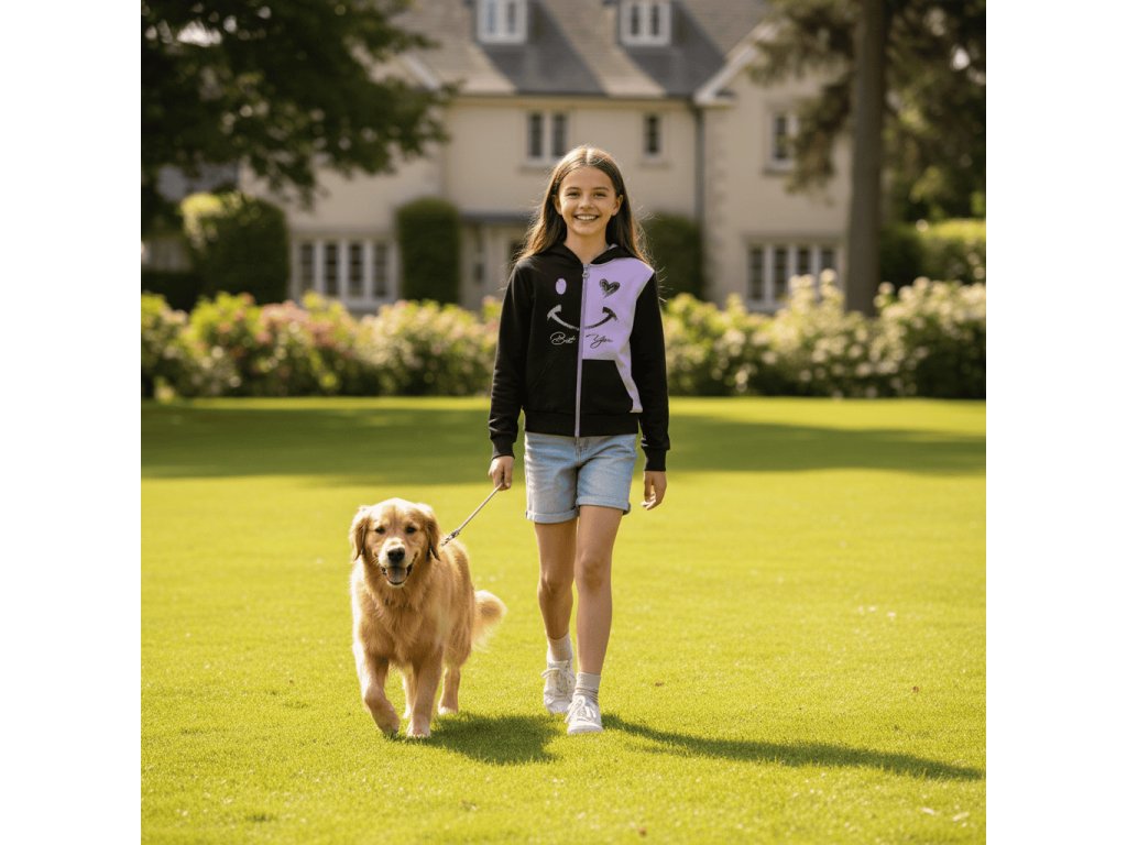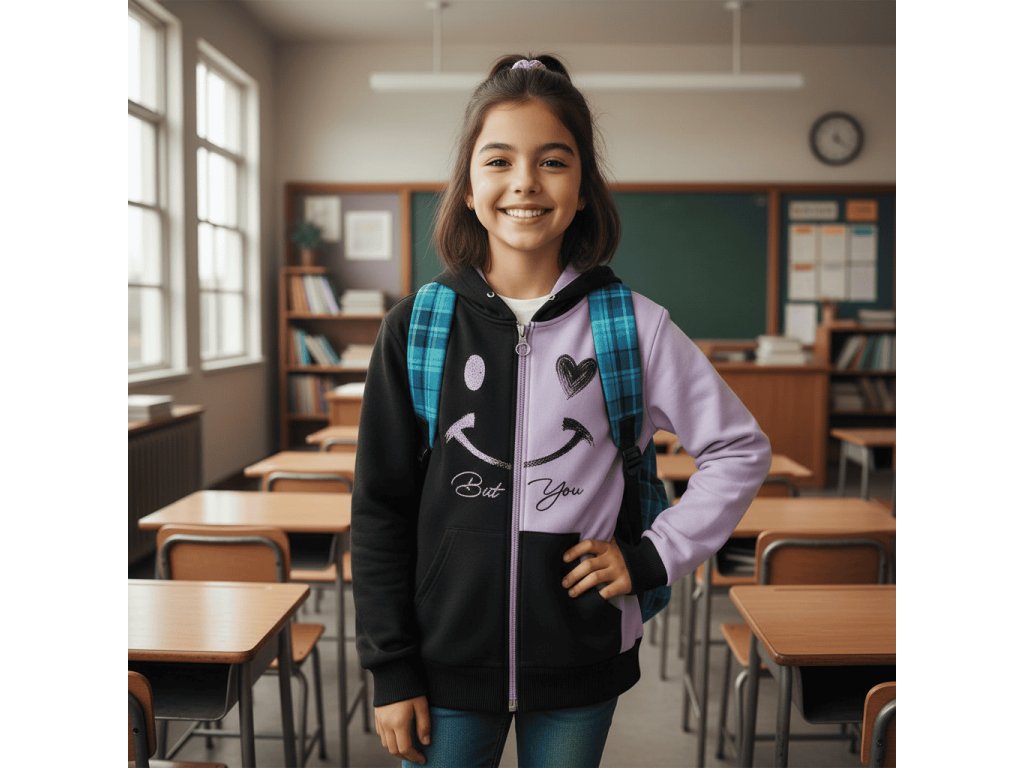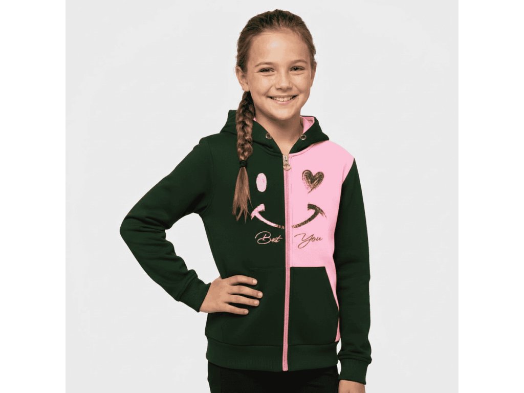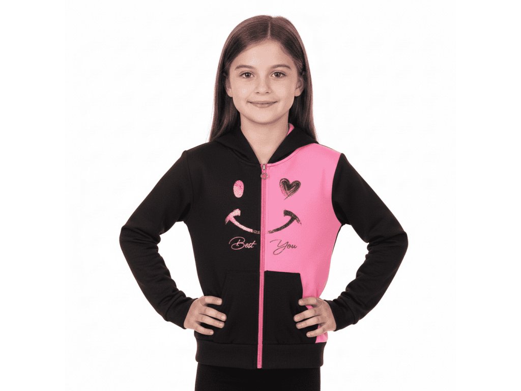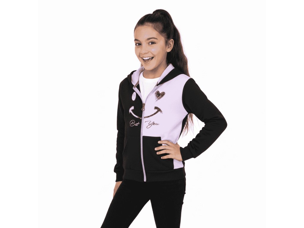 Velmi oblíbená dívčí mikina s kapucí na zip.  Mikina je v pase do pružného nápletu a dobře obepne jakoukoli postavu dítěte. Rukávy jsou rovněž do pružného nápletu, který zaručuje, že se rukáv nehrne dolů a dobře drží na zápěstí. Zapínání je na kosticový zip, to je plastový zip s většími zuby. Mikina má dvě boční kapsy.