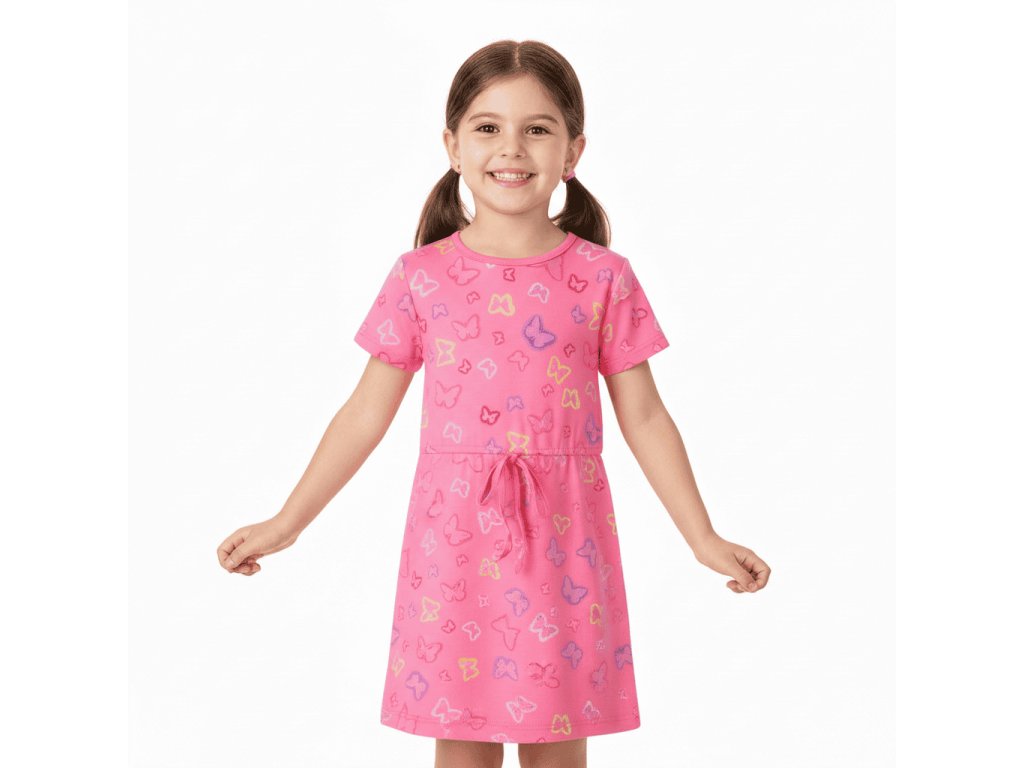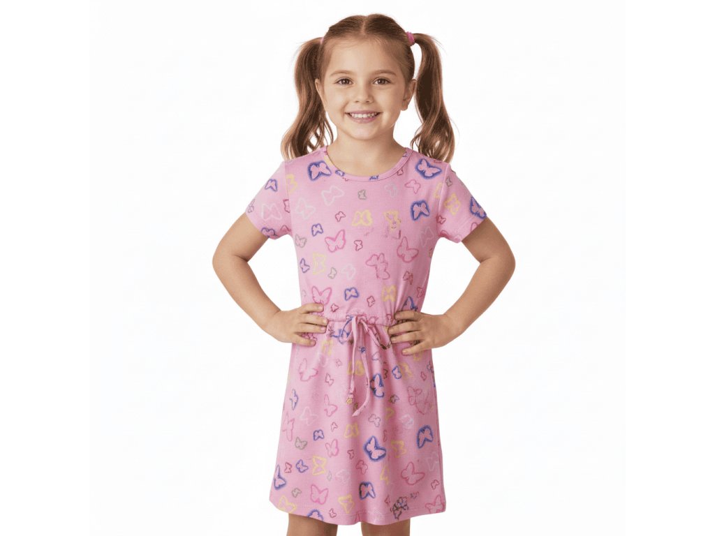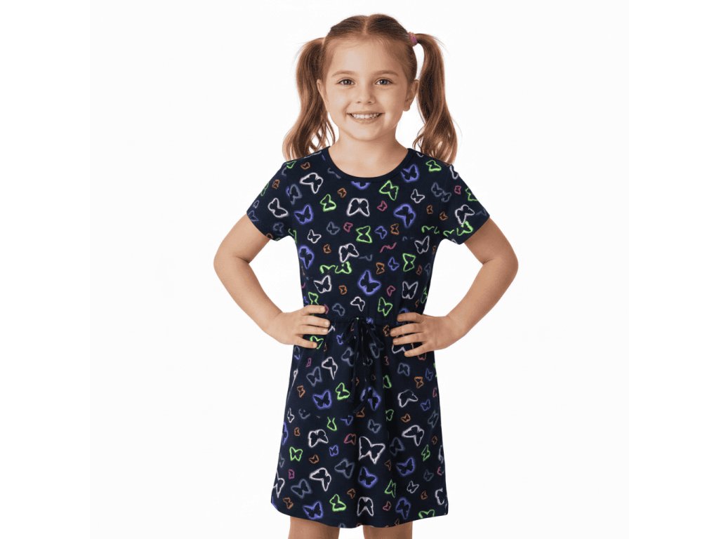 DÍVČÍ ŠATY S MOTÝLKY BAVLNĚNÉ S KRÁTKÝM RUKÁVEM
