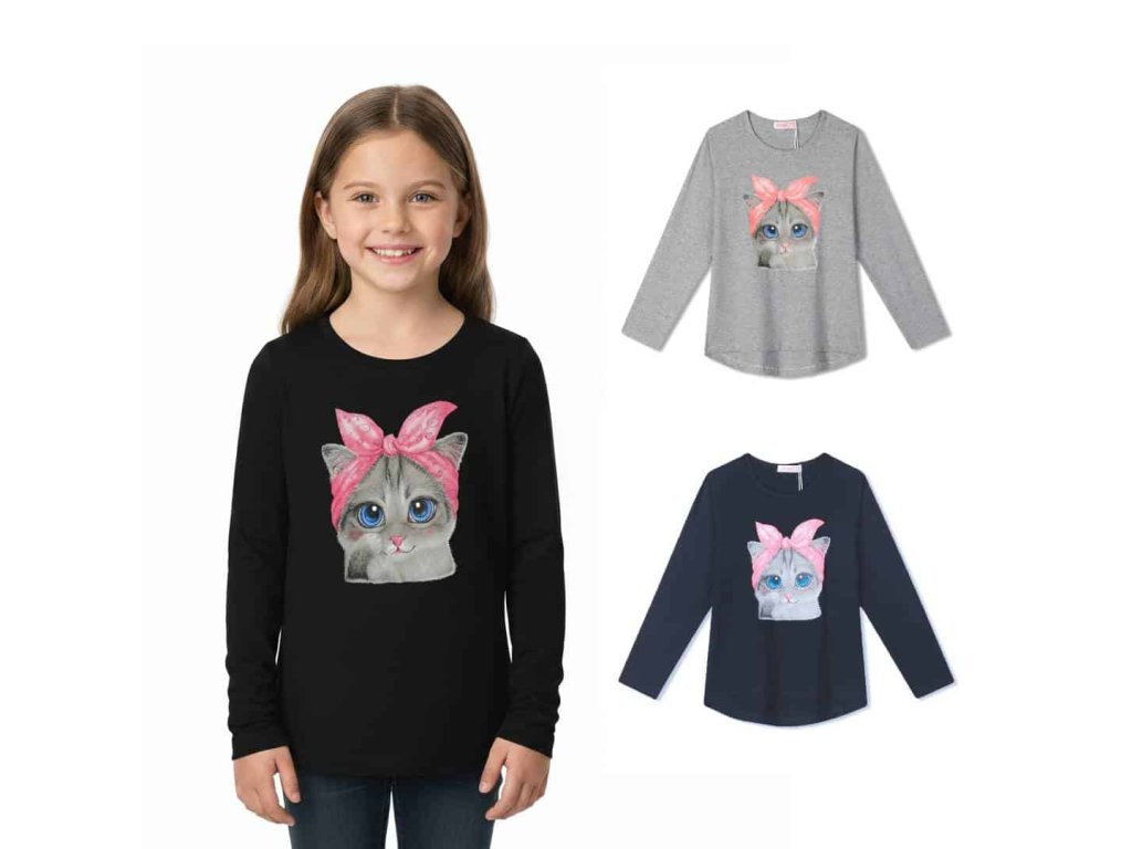 Dívčí tričko s dlouhým rukávem a potiskem tří koček. Materiál je velice příjemný na omak i na tělo. Tričko je pružné a zachovává stálý tvar.