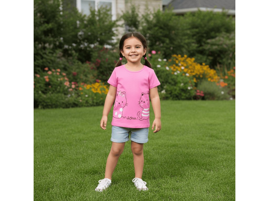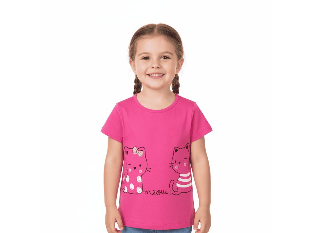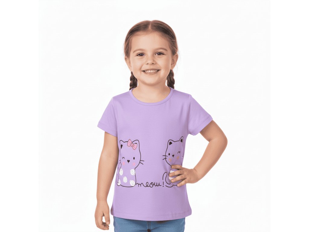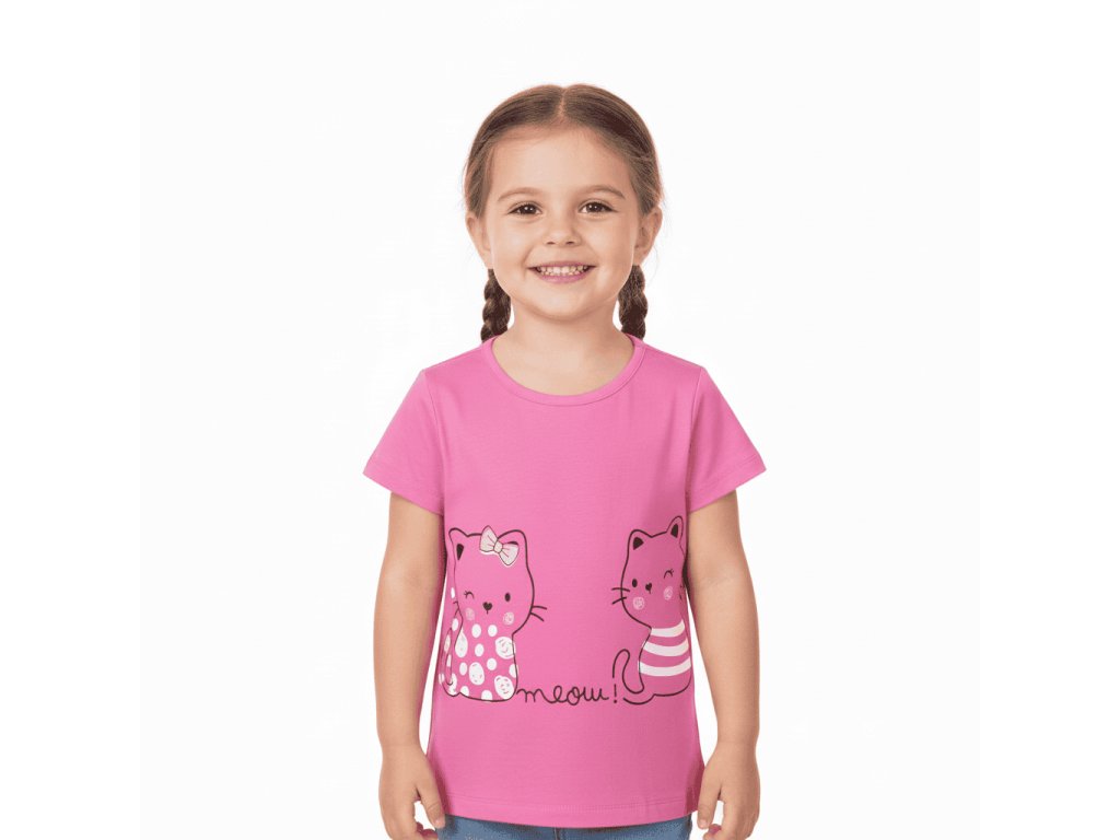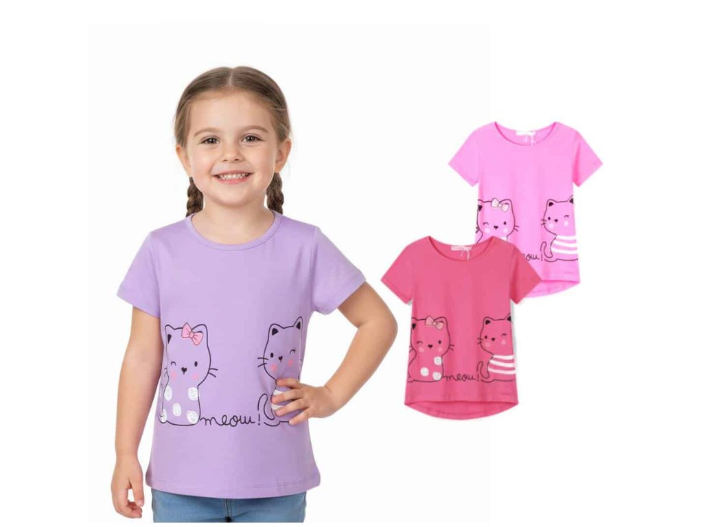 Dívčí triko s krátkým rukávem a roztomilým obrázkem kočiček, potěší každou malou parádnici. Tričko se hodí jak na běžné nošení, tak i do školy a školky nebo na výlety do města.