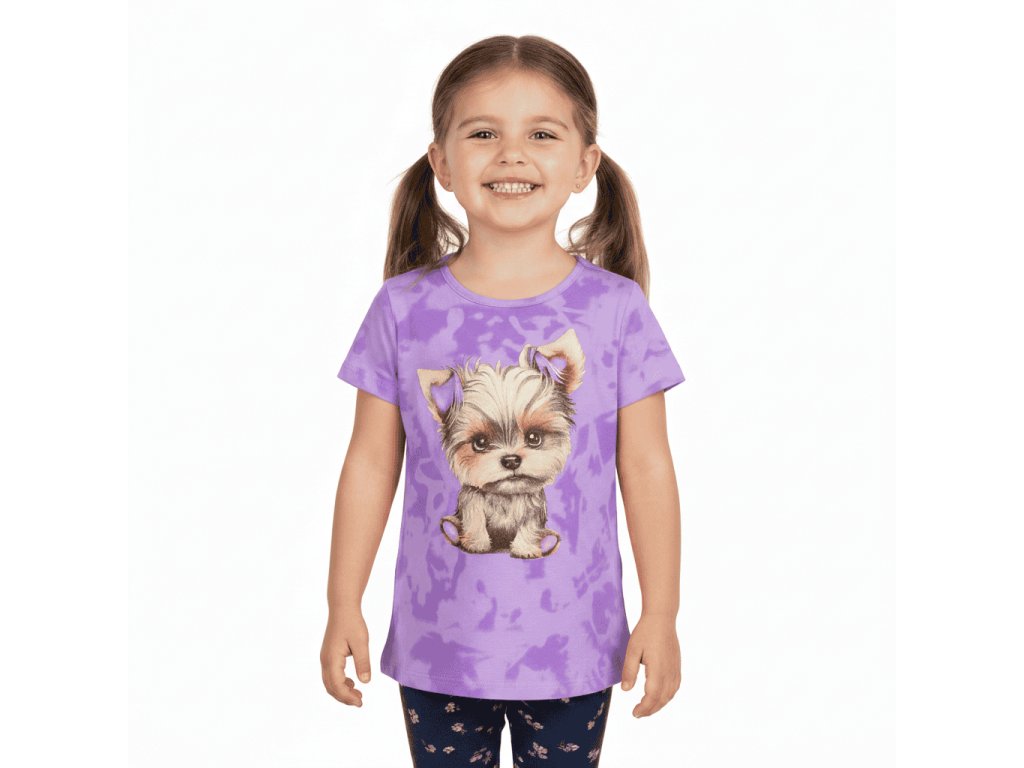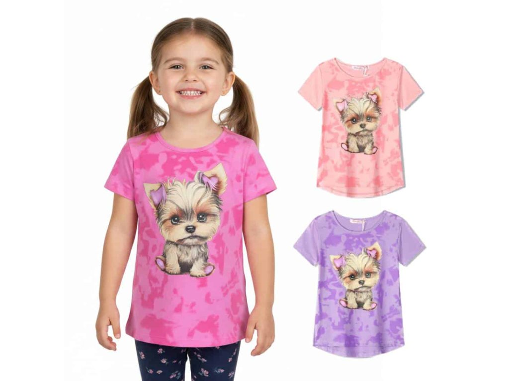 Dívčí tričko s krátkým rukávem a obrázkem pejska. Materiál je velice příjemný na omak i na tělo. Tričko je pružné a zachovává stálý tvar.