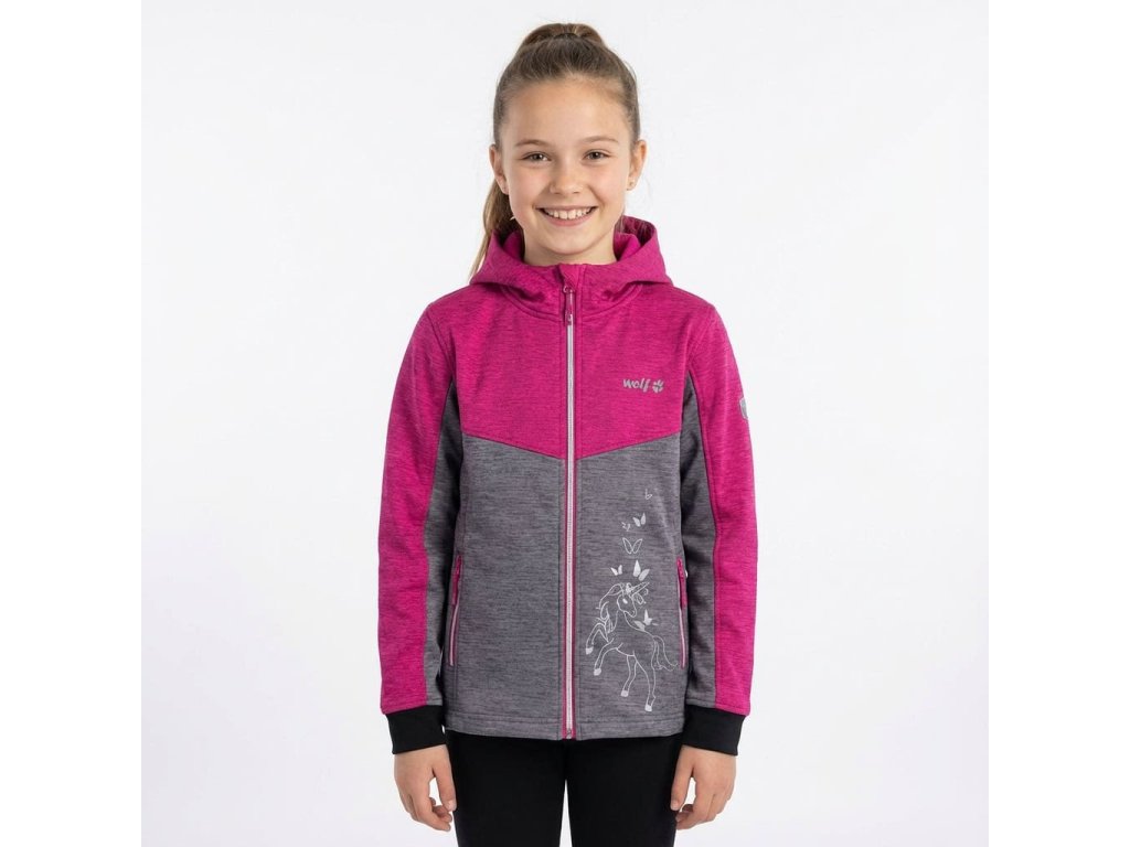 Dětská softshellová bunda zateplená fleecem značky WOLF. Krásně barevně řešená softshellová bunda z měkkého materiálu. Bunda je odolná proti vlhkosti a neprofoukne, Děti zahřeje v chladných dnech podšívka z fleecu. Záda jsou šitá do šosu - tzn., zadní díl je prodloužený, aby měly děti dostatečně krytá záda.