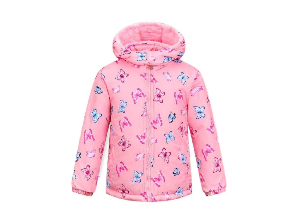 Stylová dívčí zimní bunda s kapucí a veselým motivem barevných motýlků je ideální volbou pro všechny malé parádnice. Díky hřejivé růžové kožíškové podšívce je bunda velmi pohodlná a perfektně ochrání proti chladu i větru. Hodí se na běžné nošení do školky, na zimní procházky i na hraní venku.