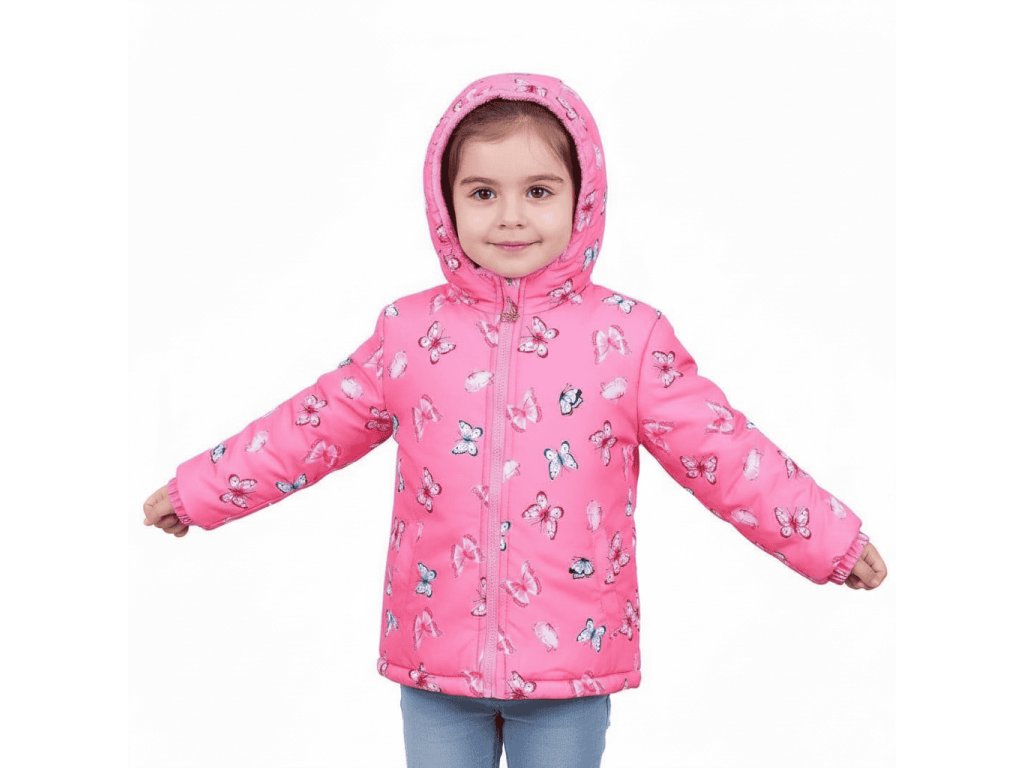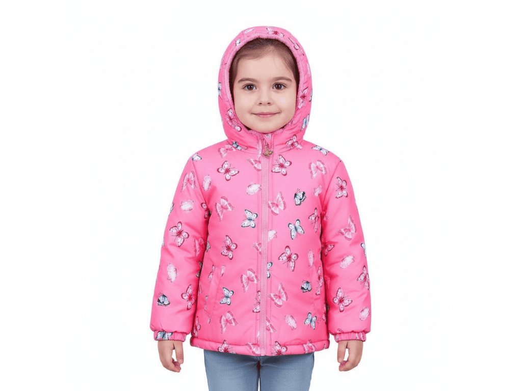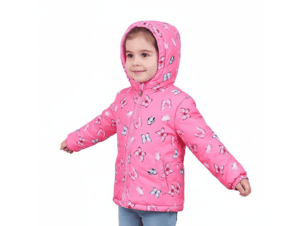 Stylová dívčí zimní bunda s kapucí a veselým motivem barevných motýlků je ideální volbou pro všechny malé parádnice. Díky hřejivé růžové kožíškové podšívce je bunda velmi pohodlná a perfektně ochrání proti chladu i větru. Hodí se na běžné nošení do školky, na zimní procházky i na hraní venku.