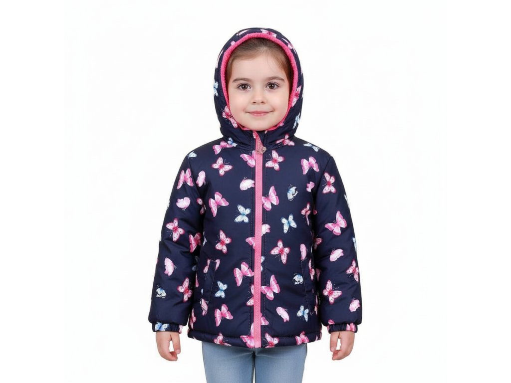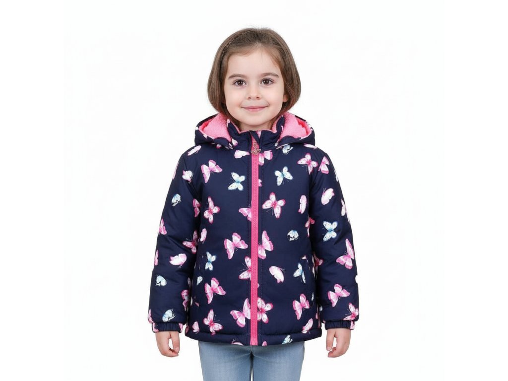 Pokud hledáte moderní dětskou zimní bundu, tento kousek si vaše holčička určitě zamiluje. Originální potisk s motýlky dodává bundě veselý a hravý vzhled.