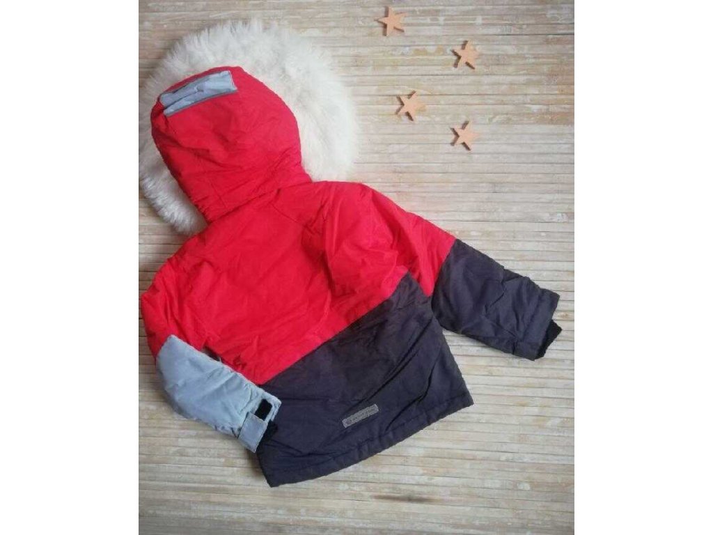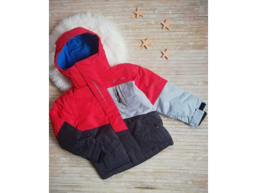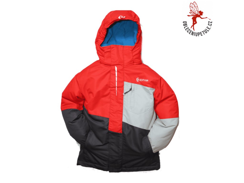 Chlapecká voděodolná zimní bunda z pevného šusťáku značky ECHT. Bunda je vyteplená a má hřejivou fleecovou podšívku. Je určena do chladného zimního počasí. Bunda má odepínací kapuci na zip, a dva suché zipy na koncích, které je možné zasunout do tunýlků v límci bundy.