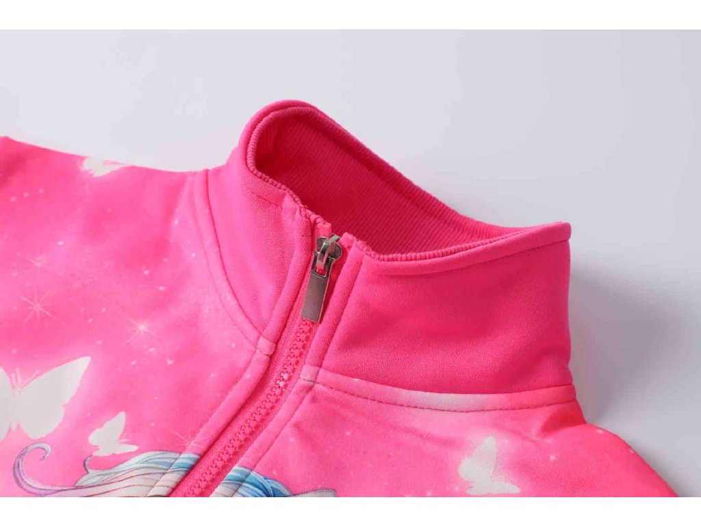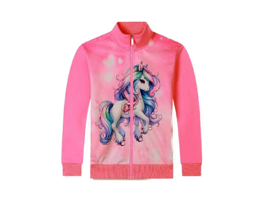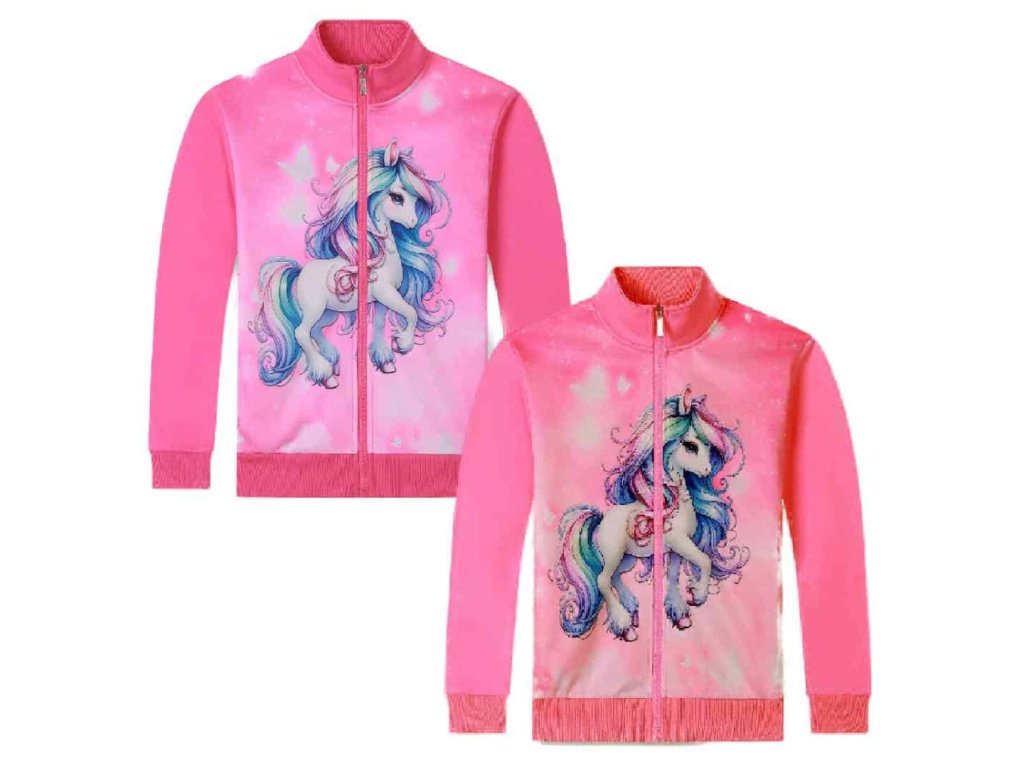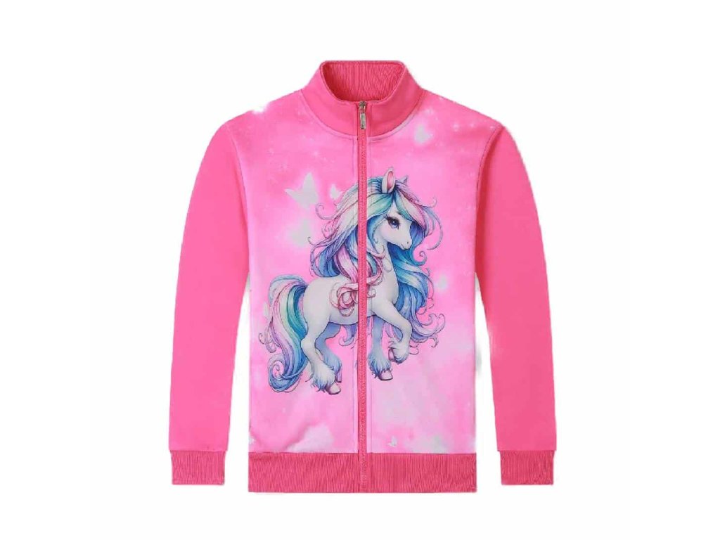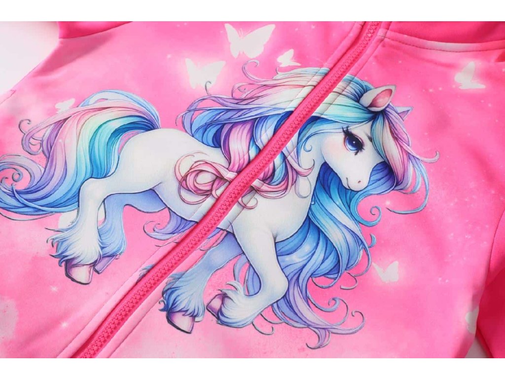 Dívčí mikina zateplená jemným chloupkem ve skvělém designu s koníkem pro nejmenší. Mikiny se stojáčkem, vpředu s dvěma kapsami vhodné na drobnosti a kvalitním kosticovým zipem pro snadné zapínání. Mikiny jsou zakončené v pase a na rukávech pružným nápletem, aby pod mikinu nefoukalo.