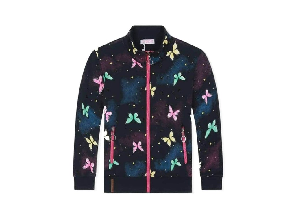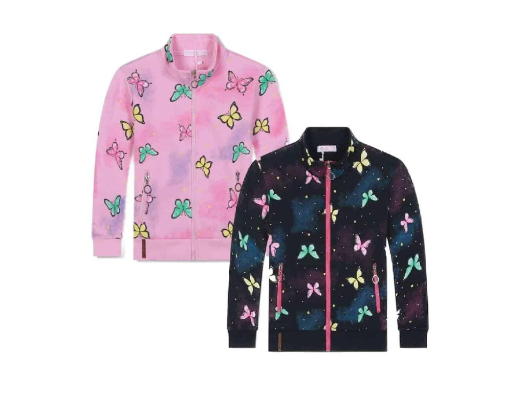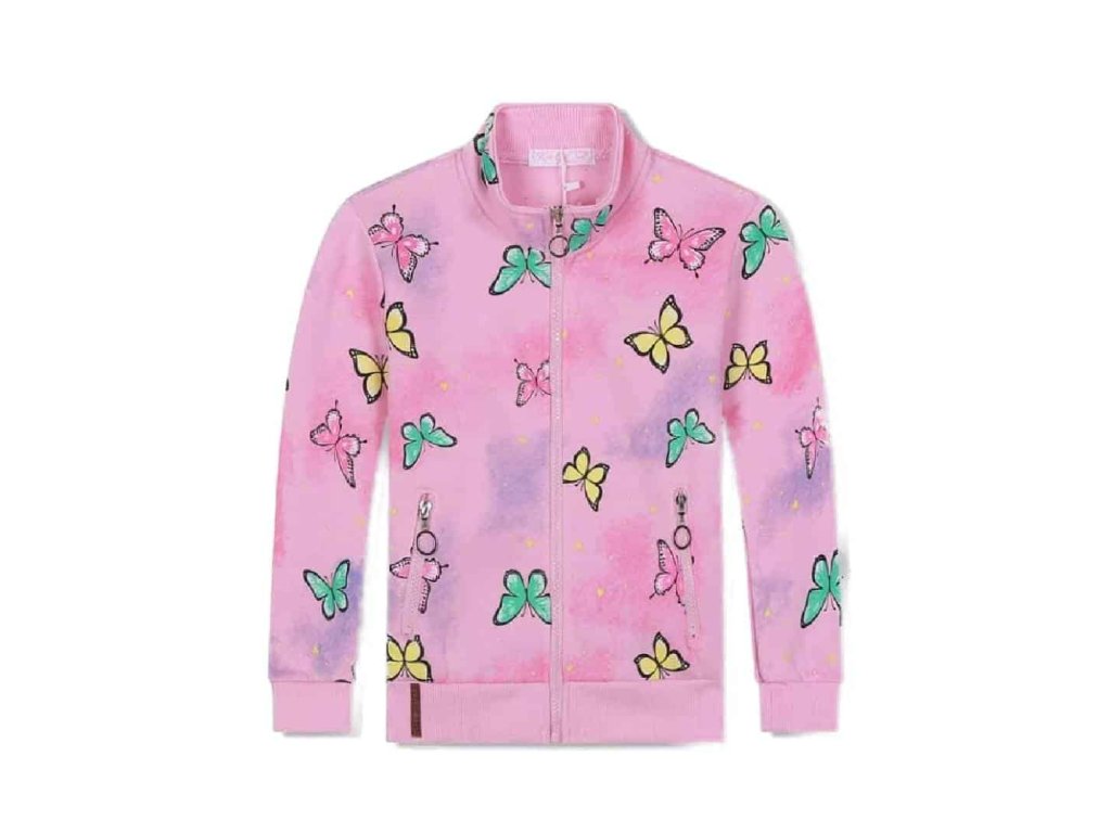 Dívčí bavlněná mikina, uvnitř zateplená jemným chloupkem ve skvělém, motýlkovém designu. Mikiny se stojáčkem, v předu s dvěma kapsami vhodné na drobnosti , je zakončená v pase a na rukávech pružným nápletem, aby pod mikinu nefoukalo. Propínací mikina na kvalitní, kostěný zip je středně silná a vhodná na jarní i podzimní počasí. Mikina je také velice vhodná do vesty. Design, ten ocení hlavně děti.